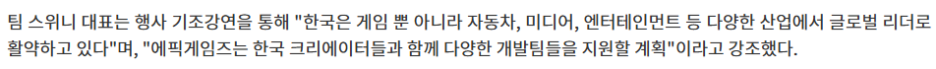 이번 행사는 전 세계 언리얼 엔진 개발자들이 최신 기술과 산업 동향을 공유하는 자리였죠. 팀 스위니 대표의 말에 따르면, "한국은 게임뿐 아니라 자동차, 미디어, 엔터테인먼트 등 다양한 산업에서 글로벌 리더로 활약하고 있는 만큼 에픽게임즈는 다양한 개발팀들을 지원할 계획" 이라고 강조했습니다. |