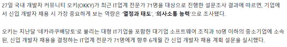 국내 개발자 커뮤니티 오키(OKKY)가 최근 IT업계 전문가 71명을 대상으로 진행한 설문조사 결과에 따르면,