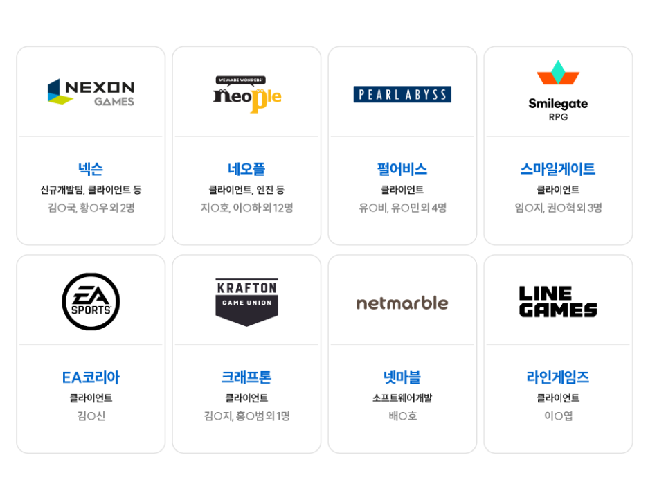 펄어비스 클라이언트 프로그래머 → 국비 과정 김**님 NC소프트 클라이언트 프로그래머 → 새싹 과정 김**, 취업반 유**님 |